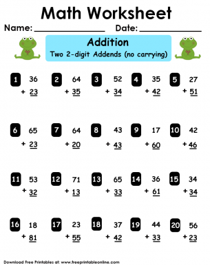 KIDZONE - Math Worksheet ADDITION two digit numbers, no carrying Autumn Themed Math Worksheet ADDITION two digit numbers, no carrying HOME. Fav 10. Top 10. Our print version allows you to print the page in a more traditional font with fewer colors and fewer images. Use the "PRINT" link to print only the content in the white space below: [PRINT] [Close Window] ... 4-digit Numbers Addition without Carrying - getcalc.com Worksheet: 4-digit Numbers Addition without Carrying. 4-digit numbers addition without carrying worksheet is the largest collection of practice problems and solved exercises which can be served as homework, classwork or assignment problems for the students to learn, practice, assess, iterate and master the skills of how to solve such addition problems in basic mathematics. Adding 2-digit numbers in columns (no regrouping) - K5 Learning Column addition worksheets: two 2-digit numbers (no carrying) Grade 2 math worksheet on adding two 2-digit numbers in columns with no regrouping or carrying. Students should understand that they are adding "tens" and "ones". Worksheet #1 Worksheet #2 Worksheet #3 Worksheet #4 Worksheet #5 Worksheet #6. 5 More. Addition Without Carrying Worksheet 1 | All Kids Network Addition Without Carrying. Addition Without Carrying Worksheet 1. 12,737 Visits. 20 addition problems without carrying for kids. Use the links below to view the printable pdf formatted version of this addition practice worksheet and its answer key. Download Print Answer Key Customize...